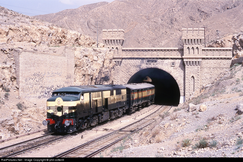 Heavily oil stained, 5 feet 6 inch gauge 3831 built in the 1950s as an ALCO DL500 leaves Kolpur with the "Chiltan Express", 1000 Lahore to Quetta. Kolpur is the top of the tortuous Bolan Pass much of which is 1 in 25 (4%) grade. All trains require helper locos on this climb.