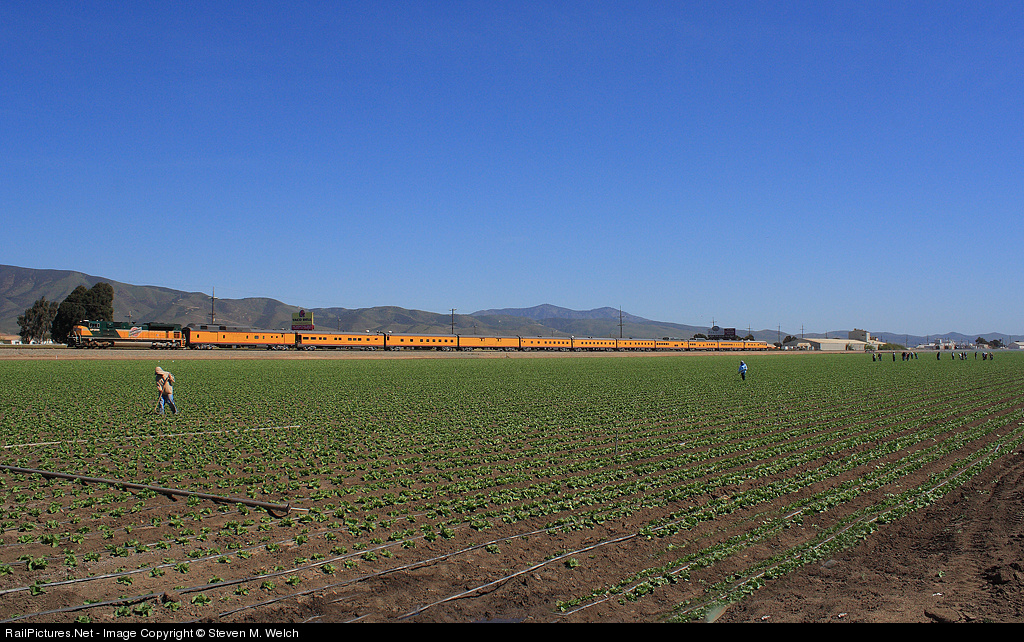 A group of skilled laborers pay no attention to the 11 car special led by the CNW Heritage unit as it rolls by the lettuce fields of the Salinas Valley.