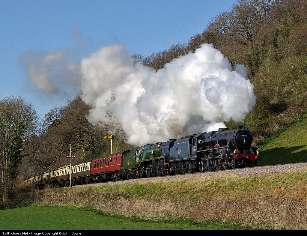 | LMS 45231 'The Sherwood Forester' & SR 34046 'Braunton' doublehead the 1605 Minehead - Bishops Lydeard during the West Somerset Railway's Spring Steam Gala.
