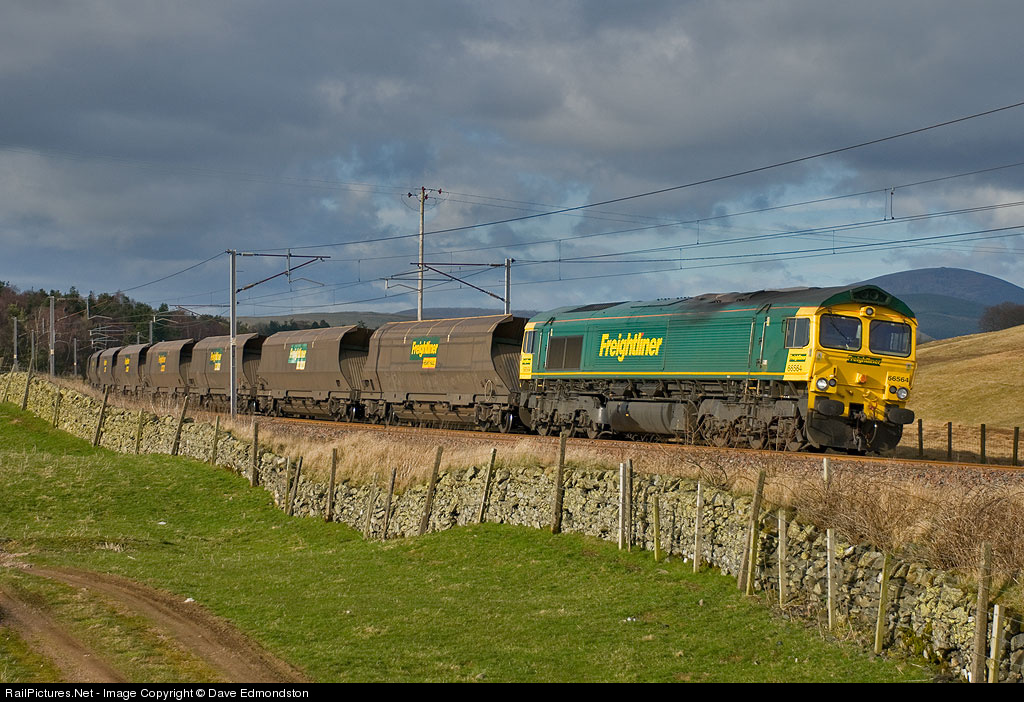| Through darkening skies, a Freightliner HeavyHaul working heads south to England from Ravenstruther coal loading facility. |