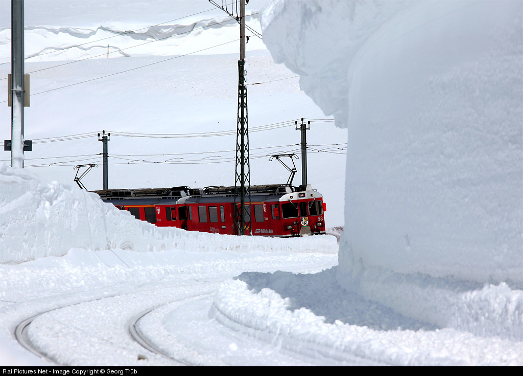 | Between several metre high snowwalls the train of the Rhätische Bahn is winding his way up and over Bernina pass. Winter still rules here 2240 metre (or about 7350 ft) above sea level near the north shore of Lago Bianco (White Lake) just at the divide between Black Sea (via Inn-Danube) and Mediterranean Sea (via Adda-Po). In the background up in the hill there is the Bernina pass road (open for traffic), although hidden behind high snowwalls. |