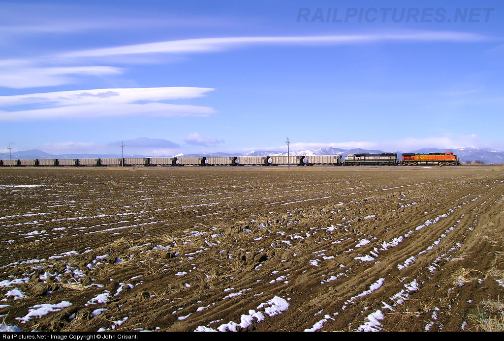 | BNSF 5668 North drags a South West Public Service @ Amarillo, Texas to Highlight Mine @ Thunder Jct West, Wyoming empty coal train out of Longmont, Colorado. Snow from a recent snow storm still shows some essence of snow left on this plowed farm field.