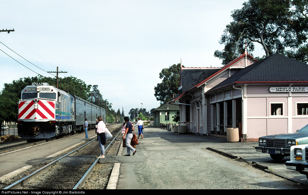 For a very short time, Caltrain ran their new F40's with the former SP bi-levels, seen here at the gingerbread station in Menlo Park ob the S. F. peninsula. Caltrain has since added the usual lights, repaving and a platform on the other side of the tracks.