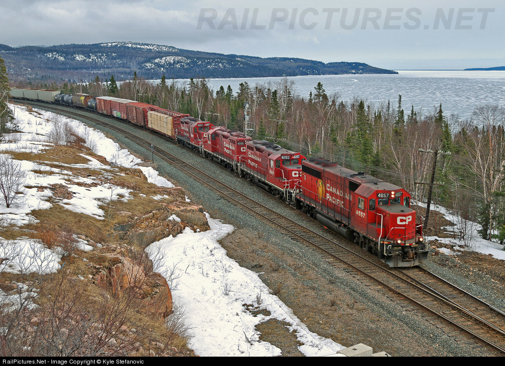 CP 221 departed Toronto on April fools day and who ever made this consists must have been fooling. 221's consists is CP 4657( A gp 40-2), and then three gp 9's( CP 8203, CP 8206 & CP 8207) and an amazing 125 cars. These old EMD motors sure worked hard on their treck to Thunder Bay but they did their job and left this railfan wondering when is the next time you will ever see a consists like this again?