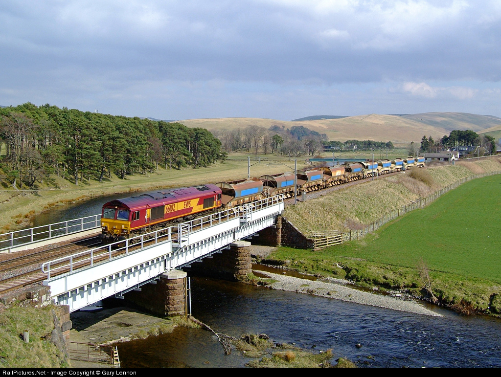 | Northbound train of ballast wagons bound for Millerhill Yard, Edinburgh (Scotland's capital city) crosses over the River Clyde. |