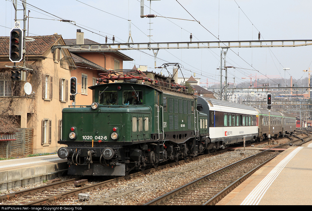 Ex Austrian Railways locomotive 1020.042, which is based in Bludenz/Austria and belongs to the association "1020.042" in Oberriet/Switzerland, is entering Winterthur station with a charter train. The car behind the loc is a comfortable and elegant "Salon de luxe" of the SBB, the other two cars are ex French Railways and belong to the association "1020.042".