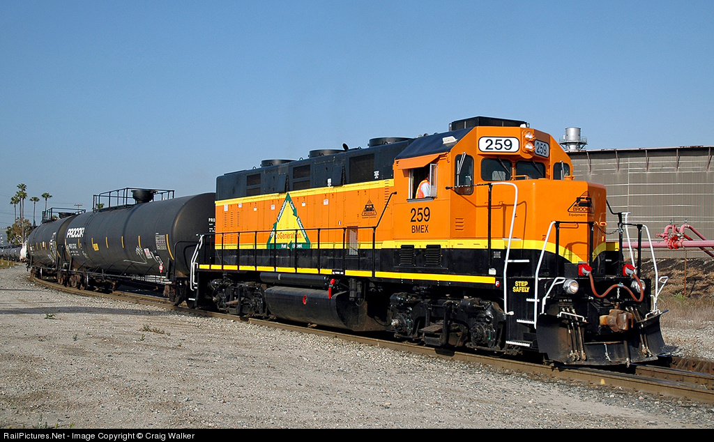 | Brookville Equipment Corporation BL20CG 259 (rebuilt from MEC GP38 259) is seen here demonstrating on the Pacific Harbor Line in southern California on April 4, 2009. This is the second day of a 30 day demonstration test. |