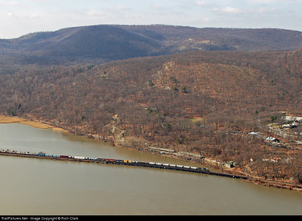 | After giving up it's second engine to Q164 in Haverstraw ( they failed to fix the engine's ability to load as they talked with the mechanical office for about an hour) this lone SD70MAC heads north with 61 cars seen here exiting Iona Island with a murky Hudson River flowing surrounding the tracks. |
