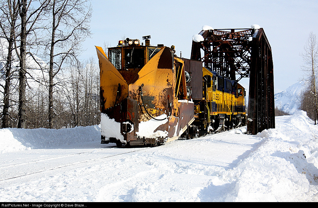 Snow Fighting - Alaska Style! - The "snow fleet" has arrived with a Jordan Spreader, two geeps, and the ARR's sole depressed center flat car carrying a big Caterpillar excavator. Spencer is not accessible by road so all the ARR's heavy equipment must be transported in by company work train. Here the train is crossing over the Placer River in the heart of the Chugach National Forrest. Just out of view to the right is Spencer Glacier, whose melt-water lake feeds this river. Classic "Spreader 7" leading the way dates from the early 1970s.