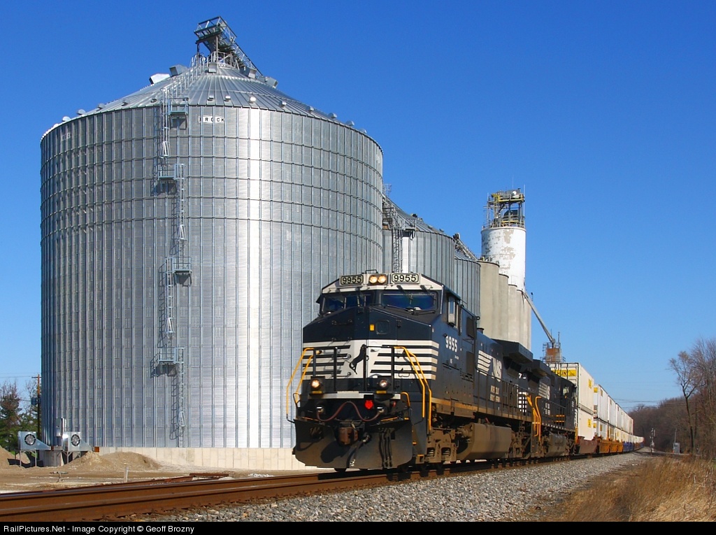 | Container train NS 234 passes by the large grain elevator in Waldo, as it heads down one of the single track portions of the Sandusky line. |