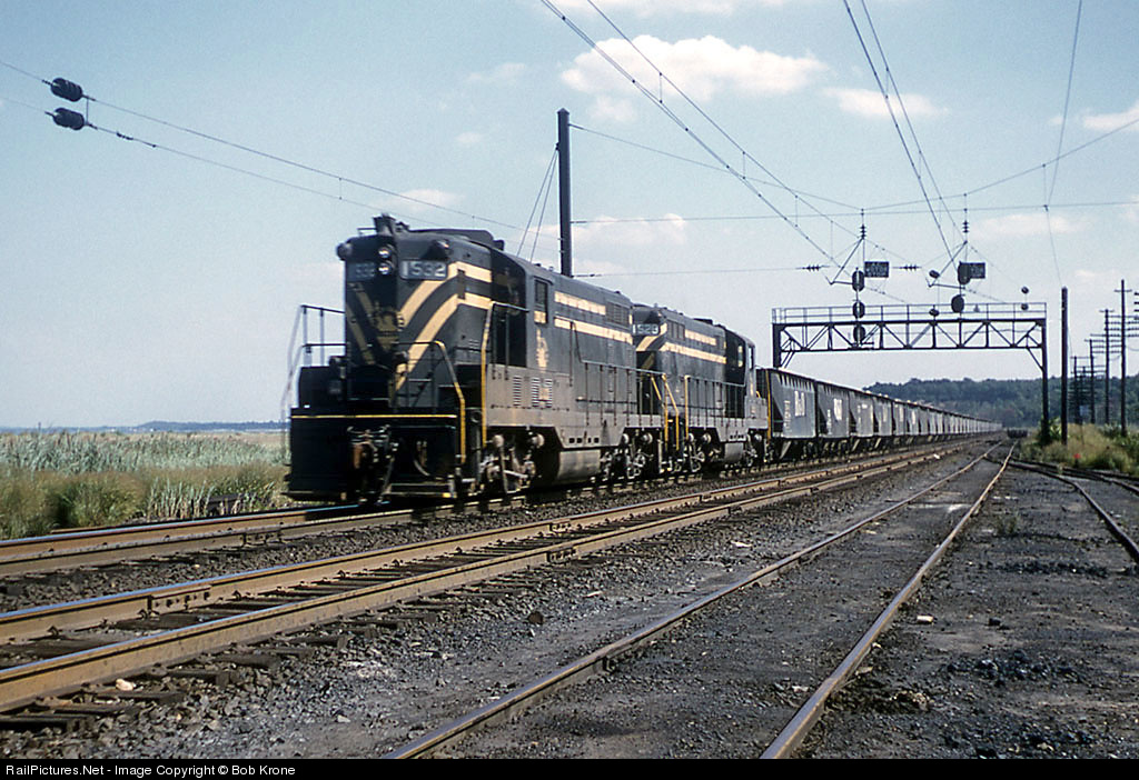 CNJ GP7s 1532 & 1529 head north at South Amboy with a long hopper car train of sand. PRR K4s 830 was sitting behind me on the siding awaiting a train from New York. GP7 1532 was leading the commuter train that plunged off the opened Newark Bay bridge on September 15, 1958 . Two GP7s and three coaches went into the water and many were killed.