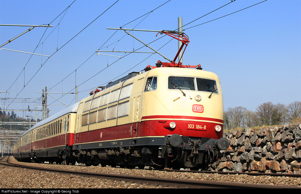 | The classic beautiful elegant 103 184 of Deutsche Bahn with a charter special "TEE Rheingold" of AKE Eisenbahn Touristik on the way from Dortmund/Germany to Domodossola/Italy (Stresa, Lago Maggiore) via Lötschberg-Simplon for a six day easter holiday. This 200 km p.h. locomotive was built in 1972 and belongs to "DB Museum" today. |
