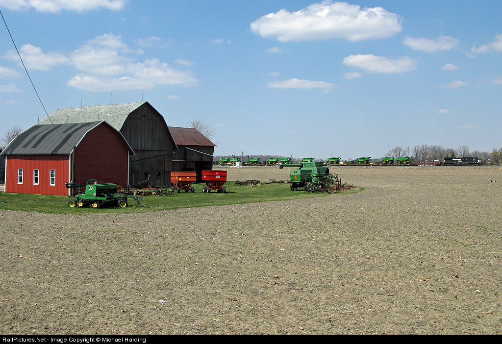 Older John Deere products await the next season while new John Deere's head East on NS 62A rolling through rural Northern Ohio.
