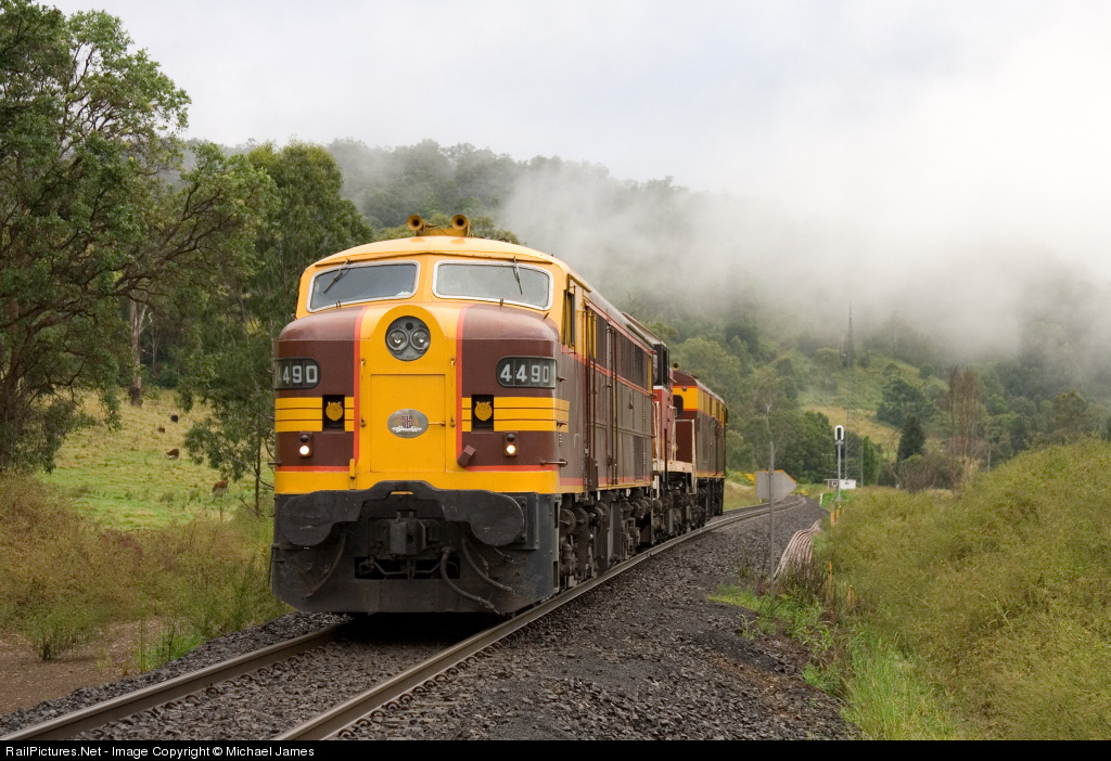 After disconnecting from their train, the RTM Ocean to Outback Aurora, 4490/4916/4306 prepare to run around using the Main Line at Loadstone on an exceptionally foggy morning in the QLD/NSW Border Ranges. This location is the last crossing loop before border.