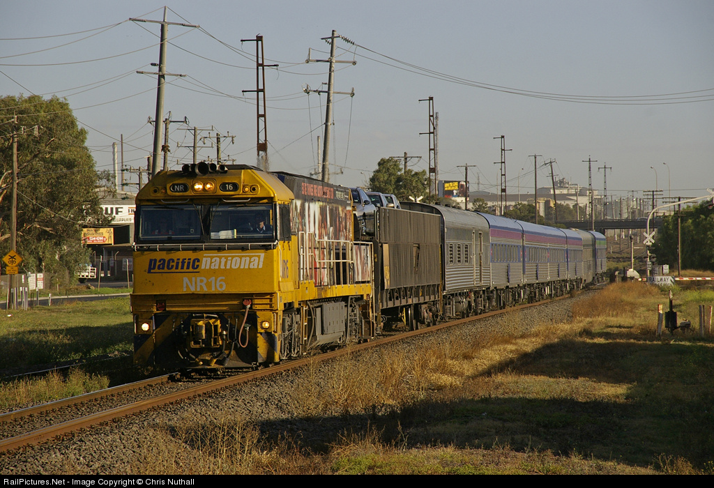 | With its recently applied level crossing awareness (similar to Operation Lifesaver) vinyls applied to the long hood, less than clean NR16 heads the GSR Melbourne to Adelaide Overland service through the land of crooked poles, at Brooklyn, west of Melbourne. |