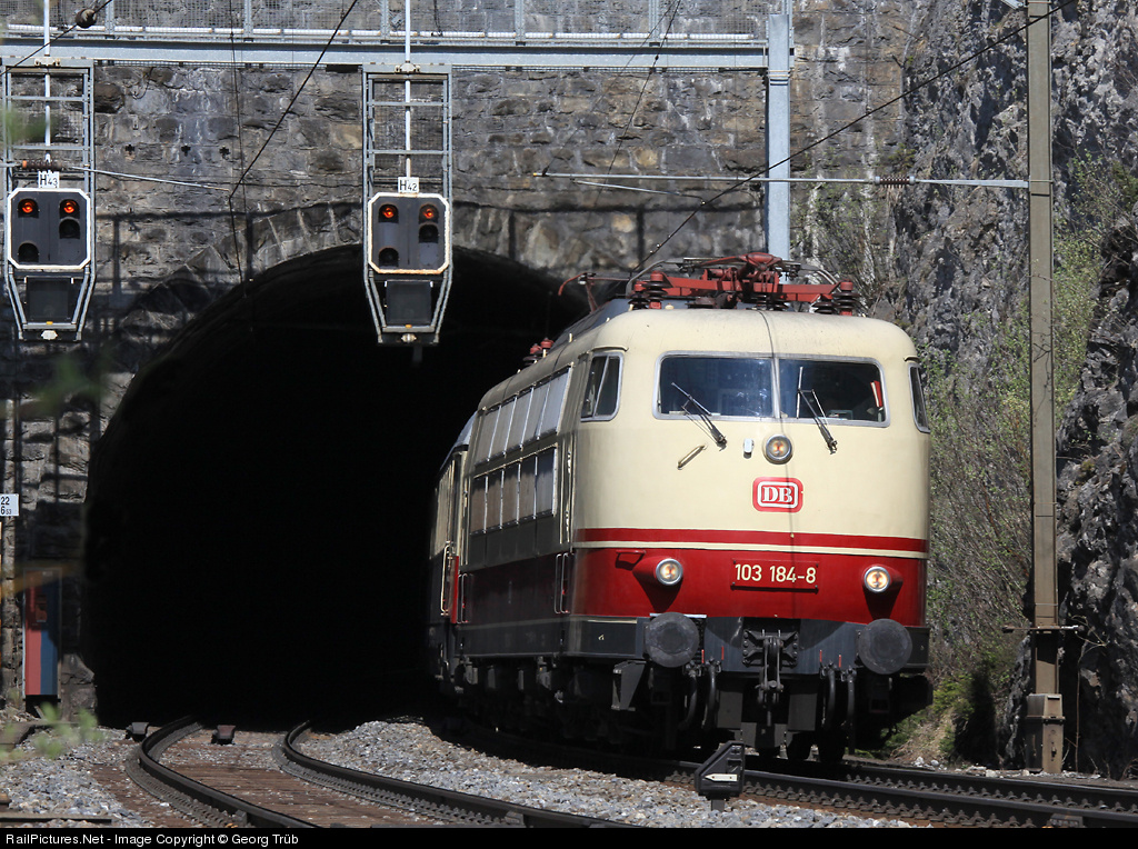 | 103 184 of DB AG (DB Museum Nürnberg) with "TEE Rheingold" on the journey back from Domodossola via Lötschberg mountain line to Dortmund is leaving Felsenburg tunnel III and entering Blausee-Mitholz station, on the northern descent from Lötschberg. |