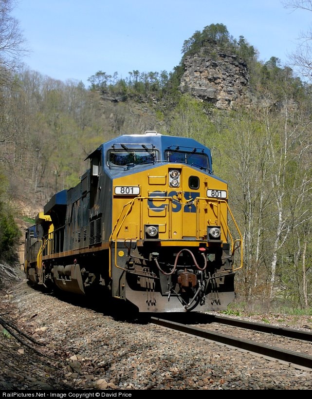 | CSX 801 has just exited the Towers Tunnel, named after the massive rock seen in the background which towers over the Breaks Gorge. Not an easy place to get to, but well worth the effort... |