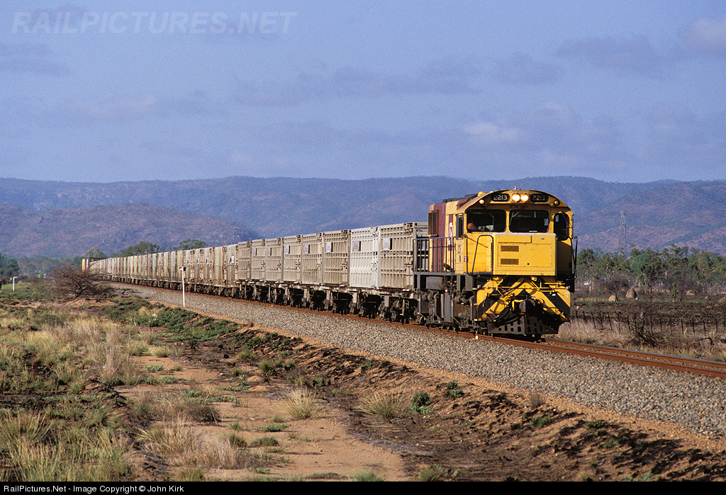 | These days, many railroads refuse to carry anything with legs – people, livestock and furniture. Queensland Rail still carries all three. QR 2213 heads a loaded cattle train across the savannah towards Townsville on the Mt Isa Line. |