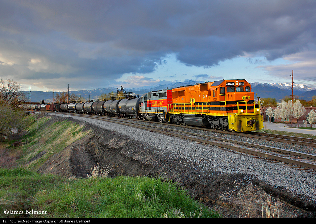 Bathed in soft evening light, Utah Railway's RUT312 local curves along the big fill just north of Vine Street in Murray City, Utah. This 14 car local is bound for Midvale yard, returning from working the refineries at Woods Cross and North Salt Lake.