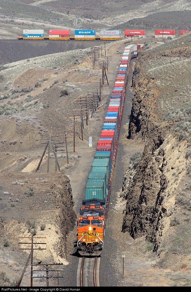| A pair of GEs struggle to drag what seems to be a mile-long box of Crayola crayons through Trinidad Loop, an unheralded engineering marvel laid out by the Great Northern that allowed the railroad to maintain a continuous 1% compensated grade from the bank of the Columbia River to the Columbia Basin plateau at Quincy, gaining more than 715 feet of elevation in 14 miles. |