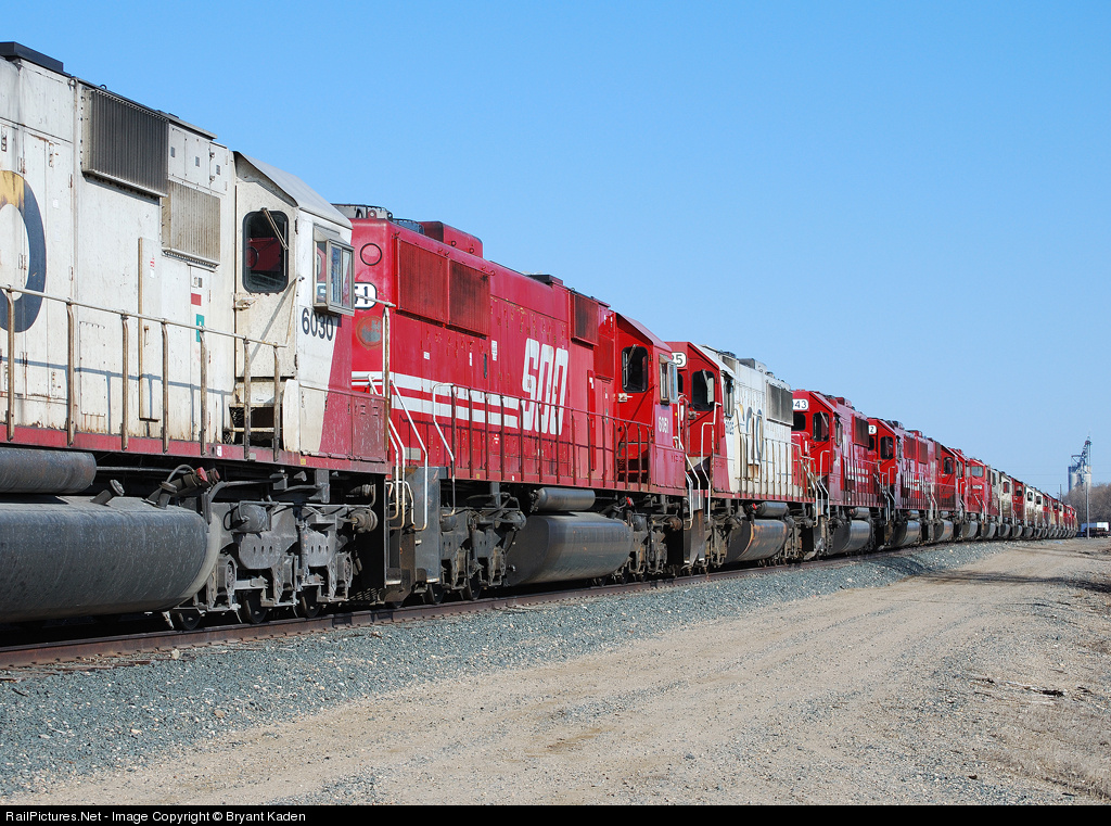 | The economic recession and subsequent traffic downturn has finally forced the CP to place a number of locomotives in storage, including this line of 27 (some not pictured) Soo Line SD60's and 60M's in Glenwood. Click here to see an aerial shot of them. |