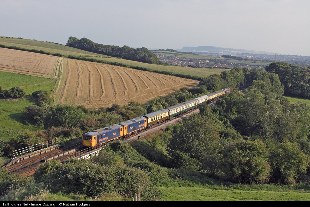 | A rare passenger working for 73s was 73204 & 73209 on the return leg of a GBRF staff charter, the pair are seen climbing Bincombe bank |
