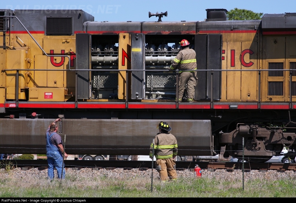 Tioga Fire Department and UP personnel survey the damage to the UP 6436, lead unit of the MFWKC, after having extinguished a fire in the engine compartment. A problem in the injection system was determined to be the cause.