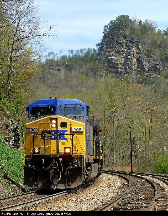 | With its namesake Towers towering in the background, CSX 208 has just exited Towers Tunnel and is rolling through the bottom floor of the Breaks Gorge in extreme Southwest Virginia on former Clinchfield rails. |