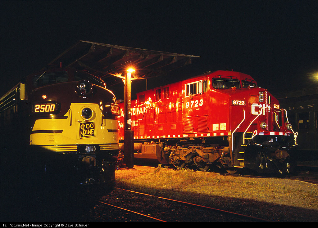 A modern CP GE poses with SOO FP7A 2500A at Duluth's Union Depot during the Lake Superior Railroad Museum's "Railfan Weekend" event. Lighting by Steve Glischinski.