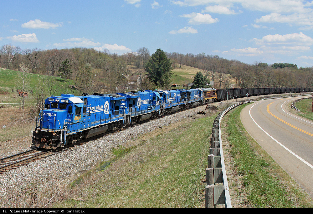 Two Super 7's and three C30-7's lead a light coal train between Bowerston and Dennison.