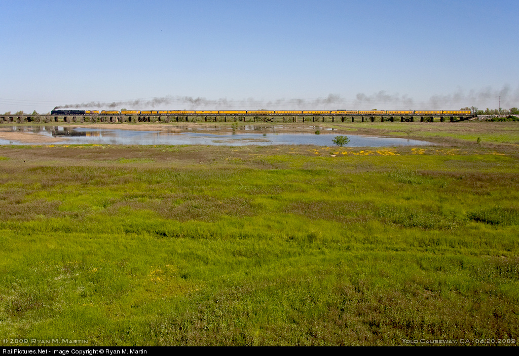| With a little bit of overflow flood water still left in the Yolo flood basin, the UP844 West steams across the Yolo Causeway between Sacramento and Davis, CA. The near horizontal smoke plume tells a story as Steve Lee has the 844's throttle wide open for this intro-stretch of the Cal-P mainline. Without diesel assistance, steam has accelerated it's train to 79mph maximum authorized passenger train trackspeed! |