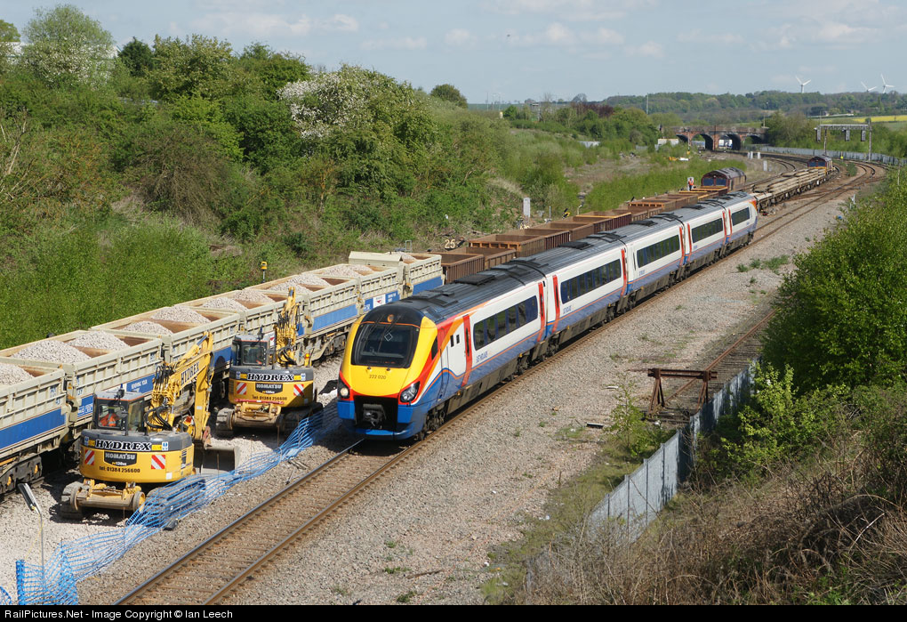 East Midlands Trains 222020 approaches Wellingborough on the slow line as major engineering work procedes on the mainlines,the up main being replaced.2 Class 66's can be seen on engineering trains.