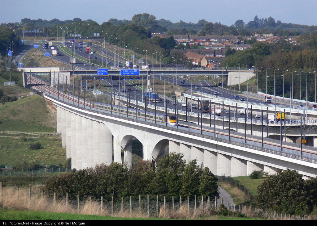 The 1304 Paris Gare du Nord to London Waterloo International skims over the Medway Viaduct at around 186mph leaving the adjacent motorway traffic standing.
