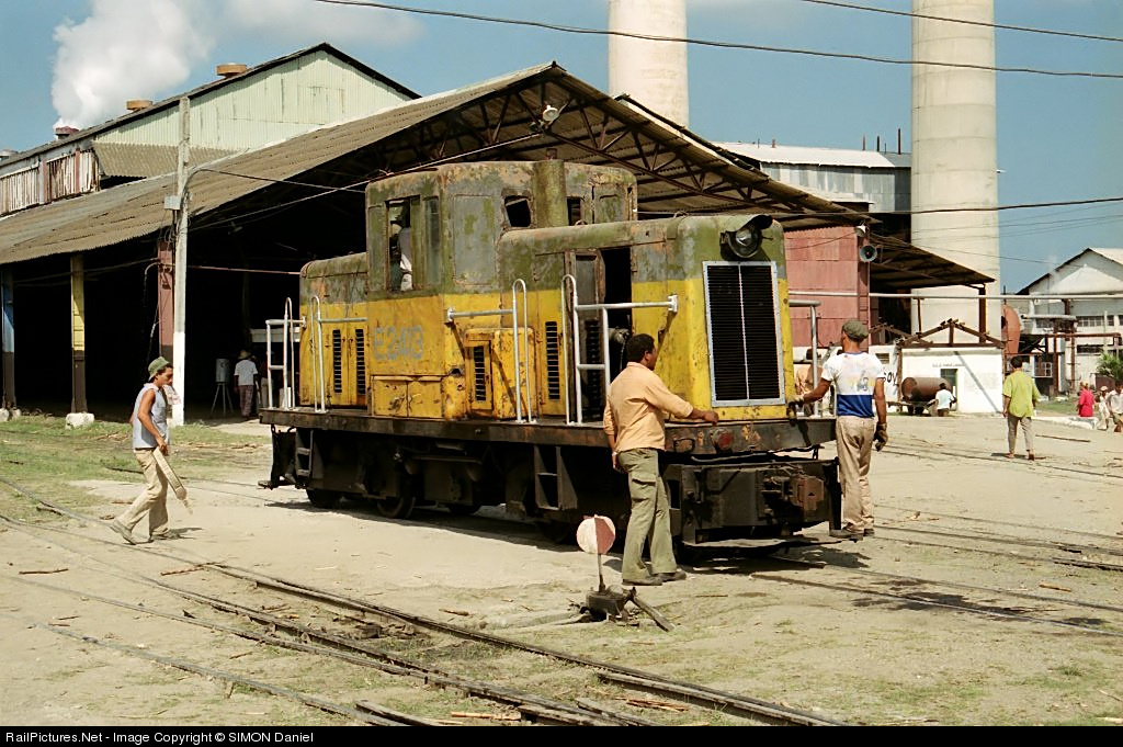 | Cuba received several used locomotives from sugar mills in Hawaii that shut down their railroad operations in the 1940's and 50's, including the yellow and green GE centercab disel unit seen here. N° 2413 was built for 3 foot gauge by General Electric in 1939 and later on converted in Cuba to 30 inches. |