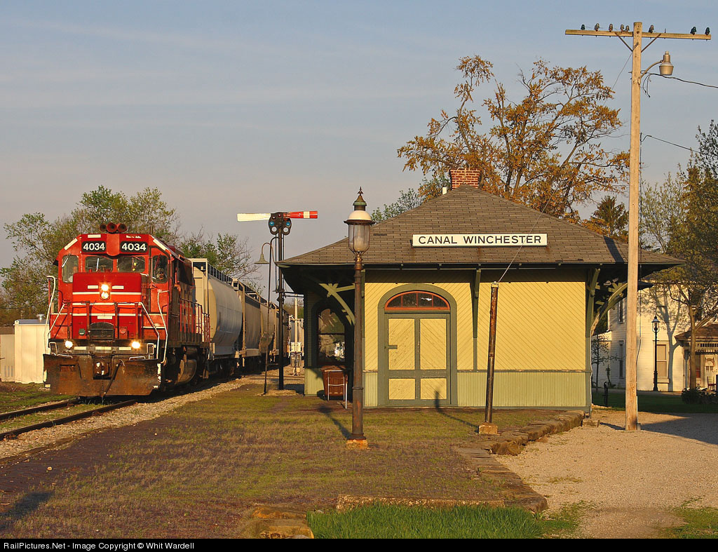 | Just before sunset IORY 4034 trundles by the former C&O/Hocking Valley depot at Canal Winchester, OH headed to Columbus to interchange with CSX. |