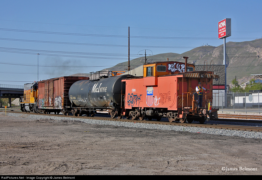 | UP's Fourth South Switcher shoves slowly through the Grant Tower area of Salt Lake City. The YRO52R is returning from a day of switching industries west of downtown. Venerable Rio Grande caboose #01503 (now used as a shoving platform) clings to life becoming a little more 'urban' in appearance with each passing day. |