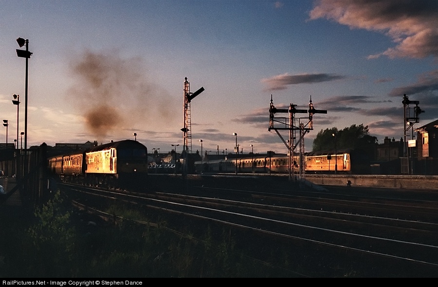 | Sunset at Stirling. 47 642 leaves the platforms with an Inverness - Edinburgh train while 47 541 awaits departure with a Motorail working for the south |