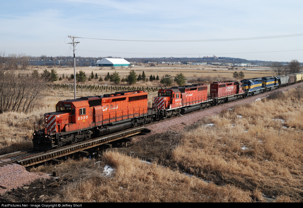 CP #5920 is caught just west of Downtown Rochester, MN. Despite the cold, the 2nd unit has its 'AC' on, although the cab is unoccupied. A paper trail, stuck to the 2nd unit's lead truck suggests that the door was left open to 'freshen up' the cab. The small wood trestle, built by the C&NW long before it was DM&E, is a common sight spanning the numerous creeks in this part of the country. A 10mph slow order, in effect since the CP takeover of this former DM&E line makes chasing easy. ON the hillside above the 3rd unit, is the historic Assisi Heights Convent, still in use today.