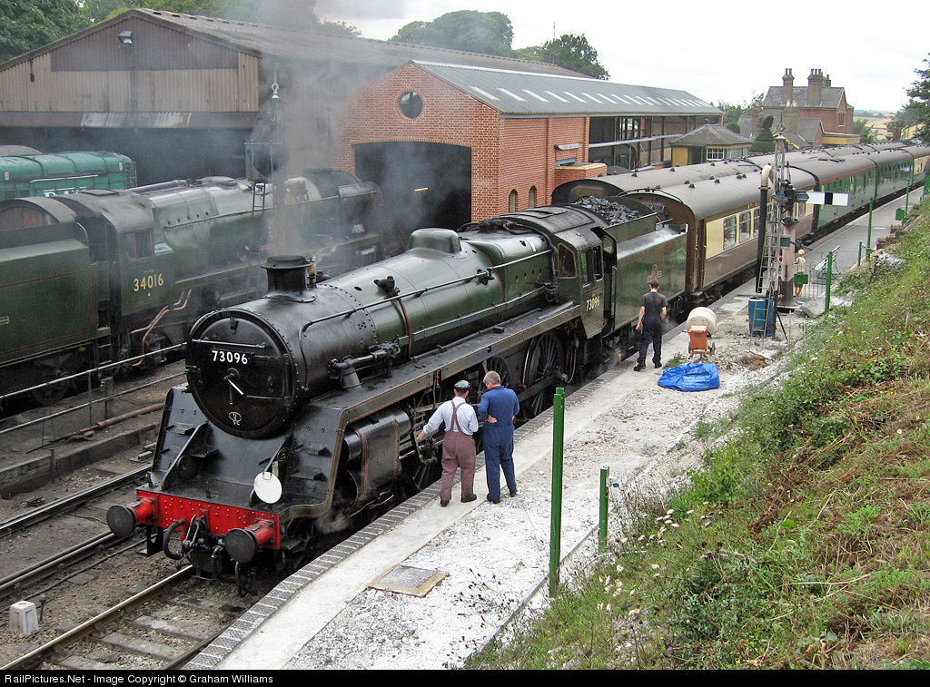 | The crew of BR Standard no. 73096 discuss something on the valve gear as it waits for departure at Ropley on the Mid Hants Railway |