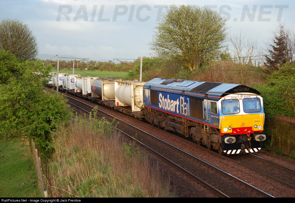 | DRS/Stobart Rail 66414 ''James The Engine'' Head The 4S44 Daventry - Coatbridge Northbound Past Ravenstruther(North Of Carstairs) Running 25 Minutes Early In A Lucky Burst Of Sunlight..Fellow DRS/Stobart Rail 66411 ''Eddie The Engine'' Passed 66414 At Carstairs |