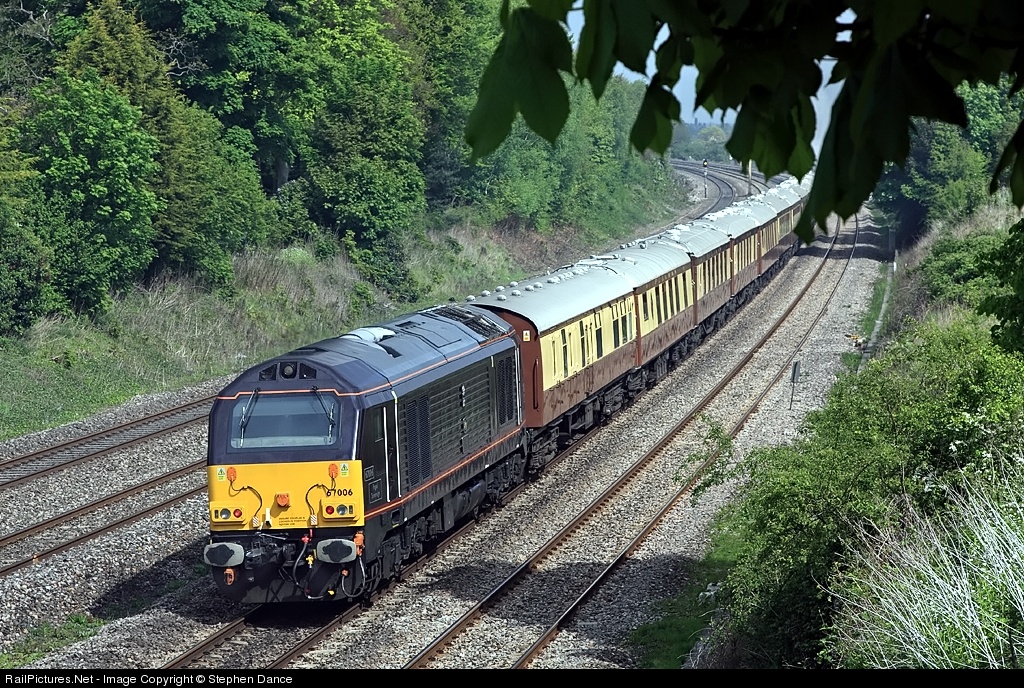 | Royal Train regular 67 006 Royal Sovereign brings up the rear of a VSOE Pullman special from London Victoria to Oxford. Rebuilt Merchant Navy 4-6-2 35028 Clan Line is at the business end. The 67 will haul the train forward from Foxhall Junction, Didcot, reversing the train ready for Clan Line to return to London in the evening |