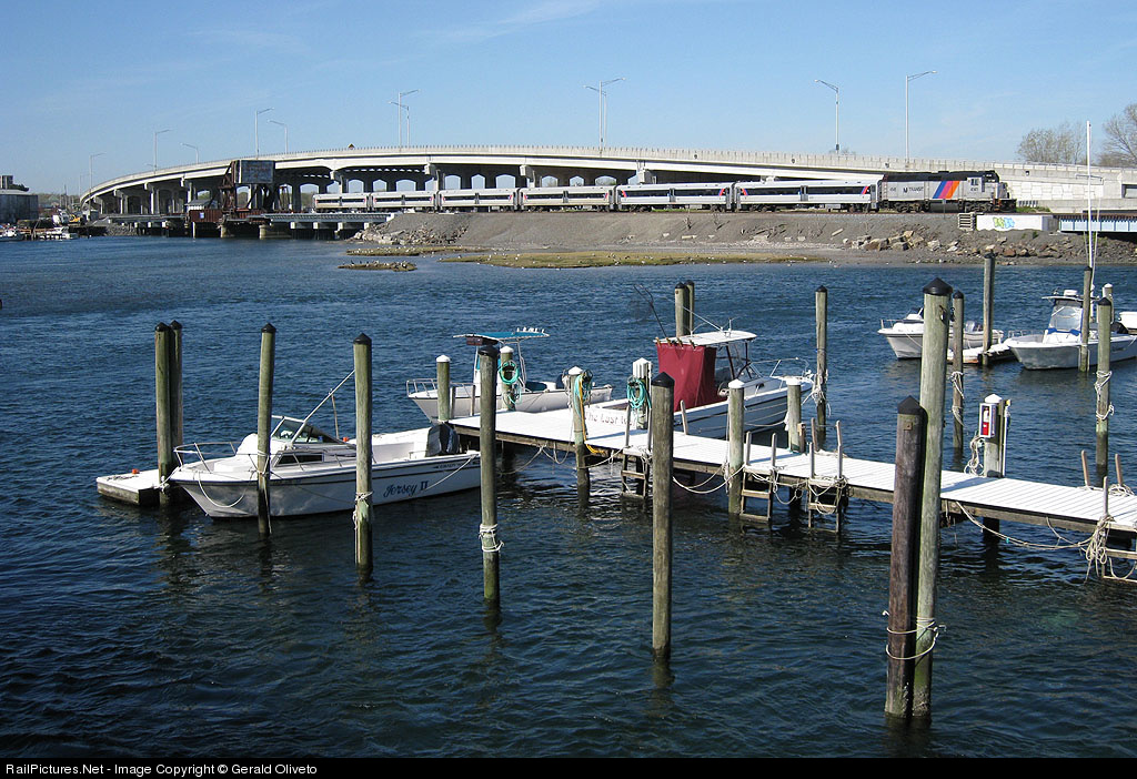 En route to Bay Head, this southbound commuter train pushes over the Shark River Bridge spanning Avon By The Sea and Belmar. The motive power on this train, GP40FH-2 no. 4141, is one of only four of this model locomotive still in active service on the NJ Transit roster.
