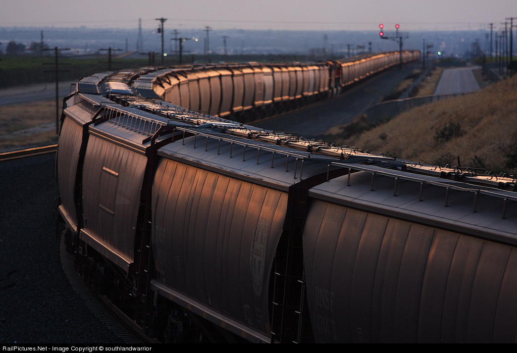 | At dusk BNSF's impressive Earthworm train passes through Sandcut northbound with its usual mid- and rear-train DPU's, and will shortly be arriving Bakersfield for a crew change. |