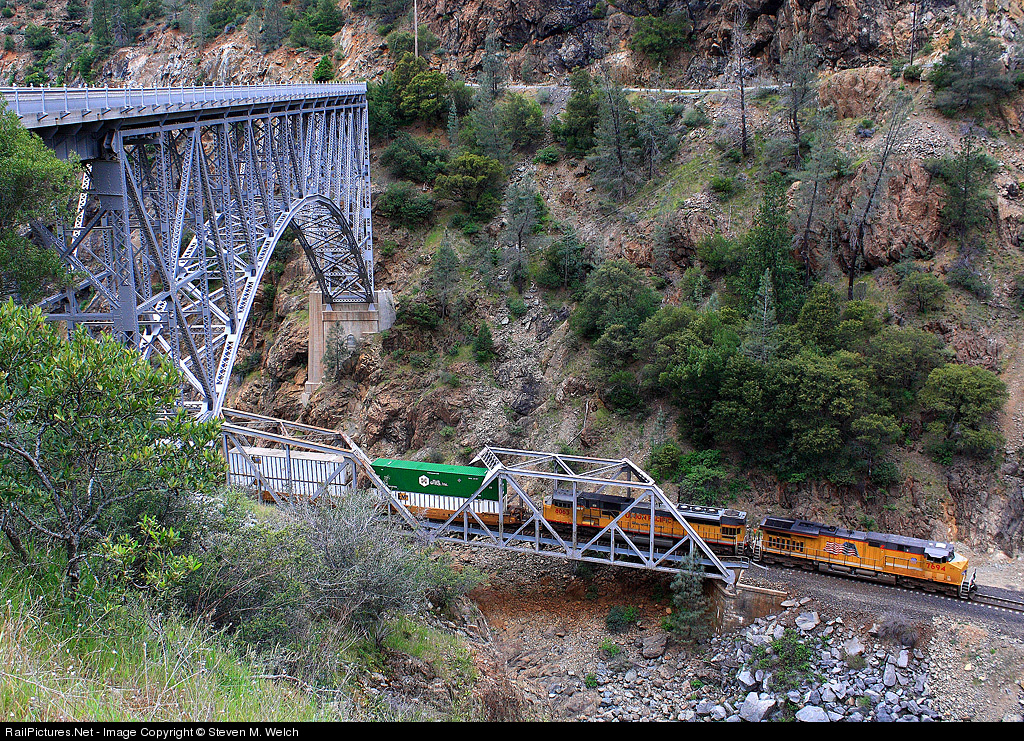 | A GEVO and a SD9043MAC duck under Highway 70 which soars high above the North Fork Feather River at the most scenic and the famous location of Pulga, as seen from the East side. |