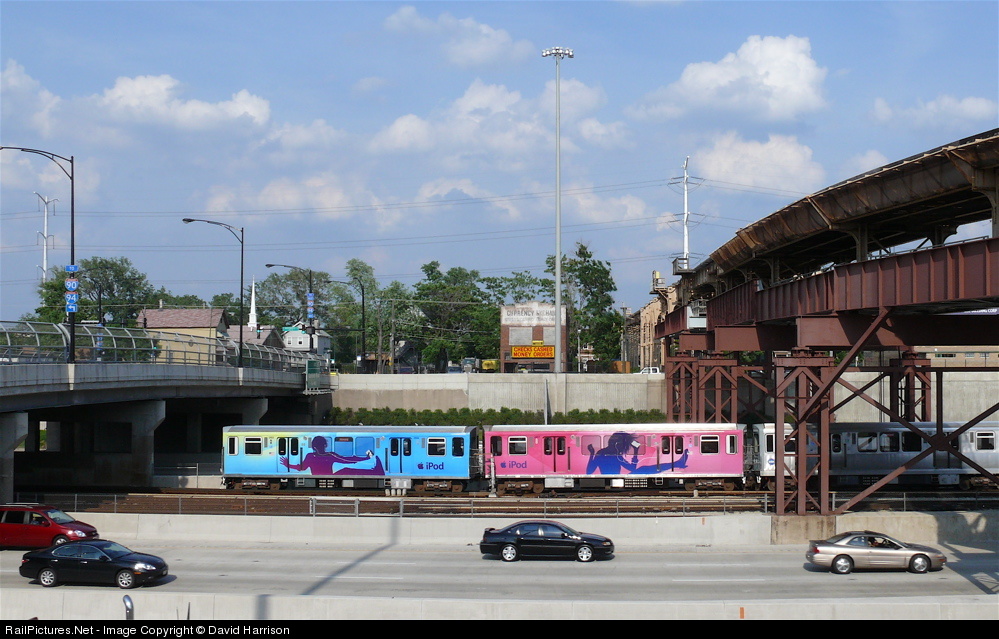 | Certainly one of the more colorful advertising wraps is this one for I-Pod. Two wrapped cars are leading this northbound Red line train at 59th ST. When this campaign debuted, an eight car train was run for quite a splash of color. |