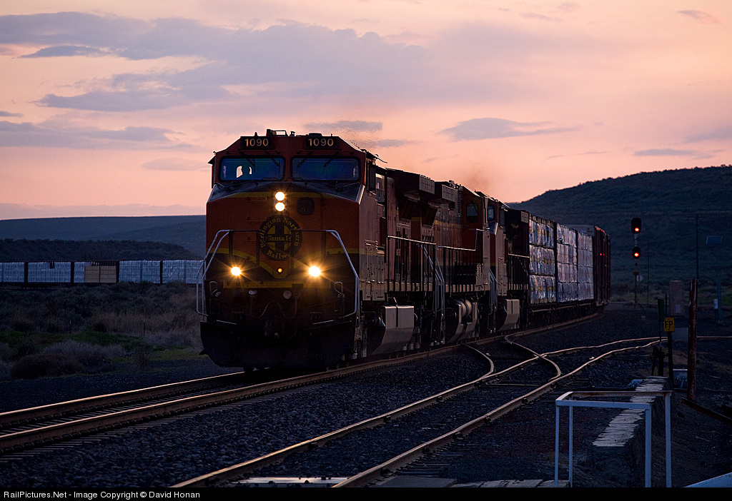 At the moment I photographed this eastbound manifest approaching Lind shortly after sunset, little did I have any clue that I had captured something unique. I later learned that these three locomotives, BNSF 1090, 1068 and 999, comprise one of two dedicated three-unit consists traveling about the BNSF system to test a new fuel optimization technology. This system functions by providing the amount of tractive effort requested by the engineer (via throttle position) through consideration of all three units' power output versus fuel consumption; for example, the system could determine that the best way to respond to a one-notch throttle increase is to increase engine RPMs in two units to full power while idling the third unit.