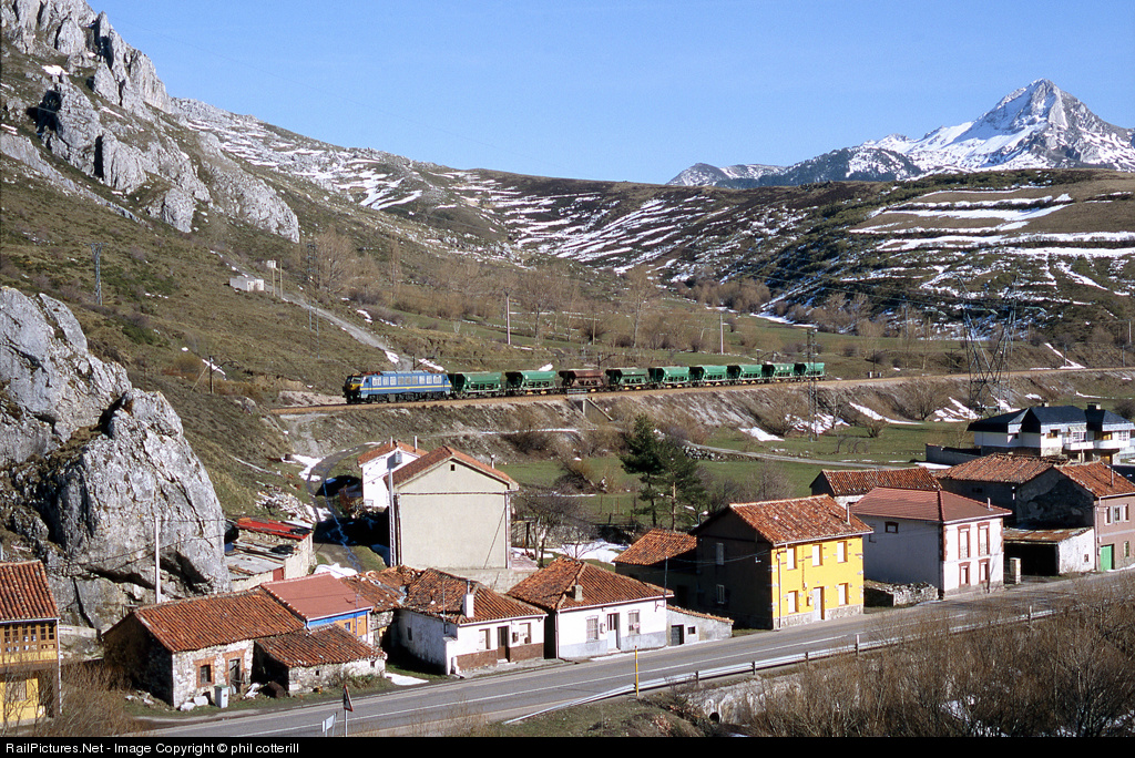 | In original blue livery, 251004 heads a northbound stone train at Villanueva De La Tercia on the very scenic Pajares Pass which will soon be replaced with a tunnel. |