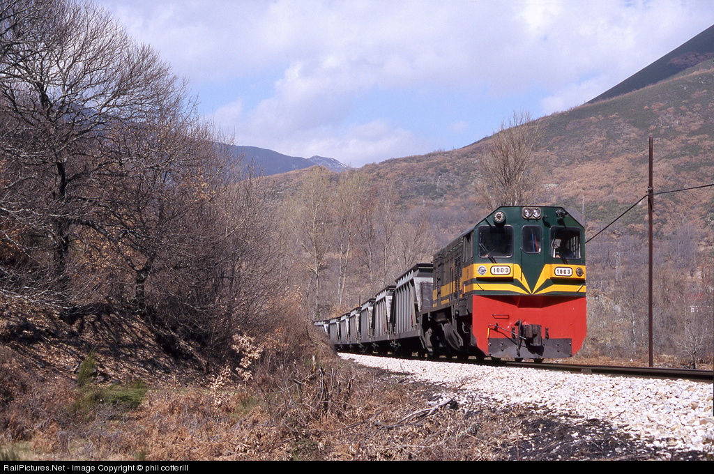 | Metre gauge 1003, built by Macosa in 1981, heads an empty train from Cubillos to the coal mines at Villablino. During our visit trains were running every 50 miutes in each direction, over this scenic line. |