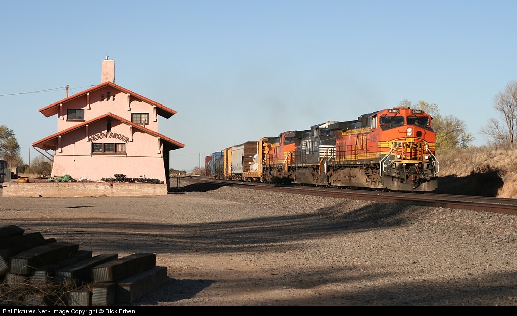 Passenger stations and agencies were once a common aspect of lineside detail. The 1908-built AT&SF depot in Mountainair is on the National Register of Historic Places and fortunately remains as evidence of a bygone era and attention to aesthetic detail (albeit in pursuit of business). BNSF 4986 is nearing the summit and about ready to go into dynamics for its long descent into the Rio Grande River valley.