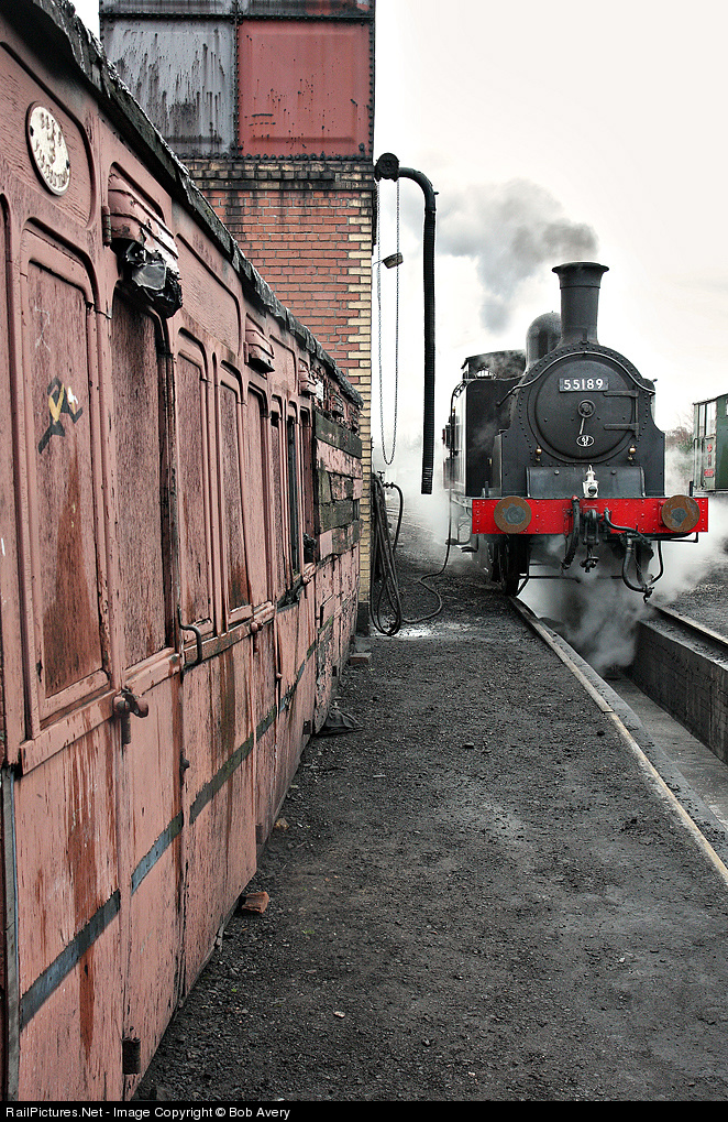 | Caldeonian railway 1907-built 0-4-4T #419 has recently been outshopped as BR #55189 in 1950s style livery. The engine is preparing for photo charter duty on Scotland's premier preserved line. I have digitally taken out a conveyor used for loading coal. I have no idea of the origin of the old coach, now used for storage. |